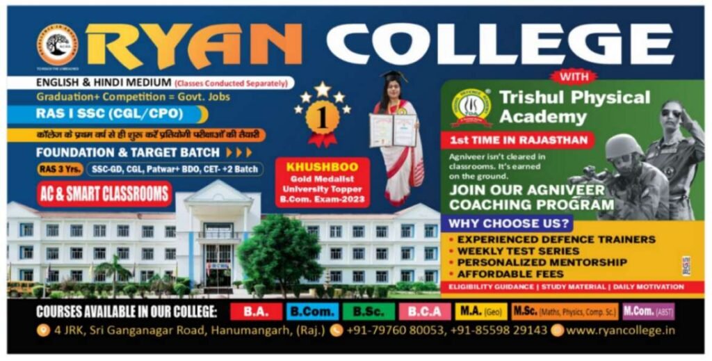हनुमानगढ़ स्थित रयान कॉलेज फॉर हायर एजुकेशन में हरियाली तीज के मौके पर कार्यक्रम का आयोजन किया गया। कार्यक्रम संयोजिका सुमीना यादव ने बताया कि महाविद्यालय में प्रतिवर्ष श्रावण मास शुक्ल पक्ष की तृतीया को तीज महोत्सव के रूप में मनाया जाता है। हर वर्ष की तरह इस वर्ष भी विद्यार्थियों द्वारा पौधारोपण किया गया। गुरलीन, नव्या तथा यासमीन ग्रुप द्वारा पंजाबी नृत्य की प्रस्तुति दी गई। खुशप्रीत, कुलवीर तथा सुखवीर समूह के द्वारा गरबा नृत्य प्रस्तुत किया गया। यशिका, वृंदा, अंशिका ग्रुप द्वारा लोक नृत्य की प्रस्तुति दी गई।
